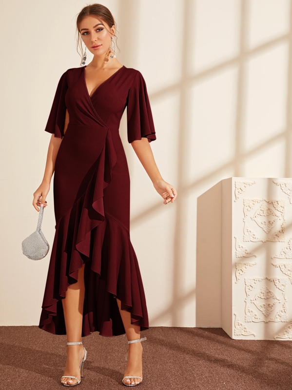 Cape Sleeve Ruffle Trim Asymmetrical Hem Wrap Dress