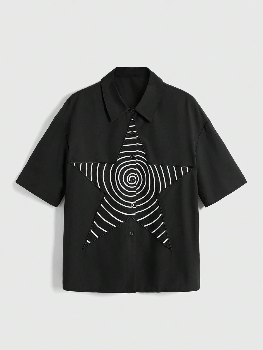 Grunge Punk Casual Punk Street Style Oversized Pentagram Patch Plaid Loose Fit Mid-Sleeve Shirt For Women