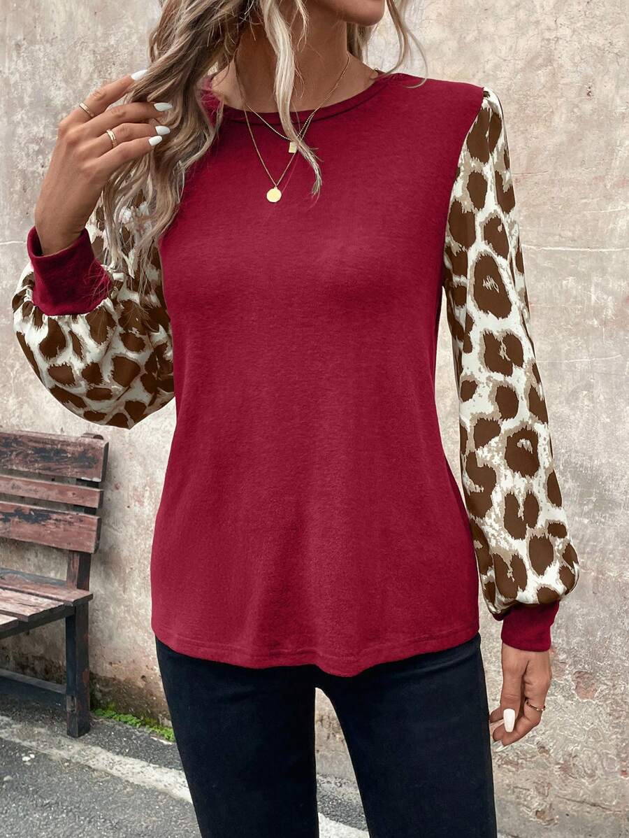Casual Work Wear Black Splice Graphic Print Round Neck Long Sleeve Women Tops, Autumn