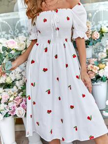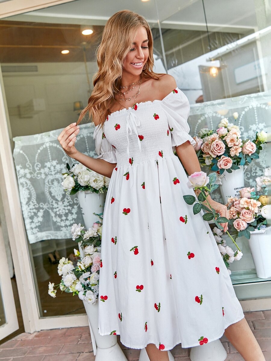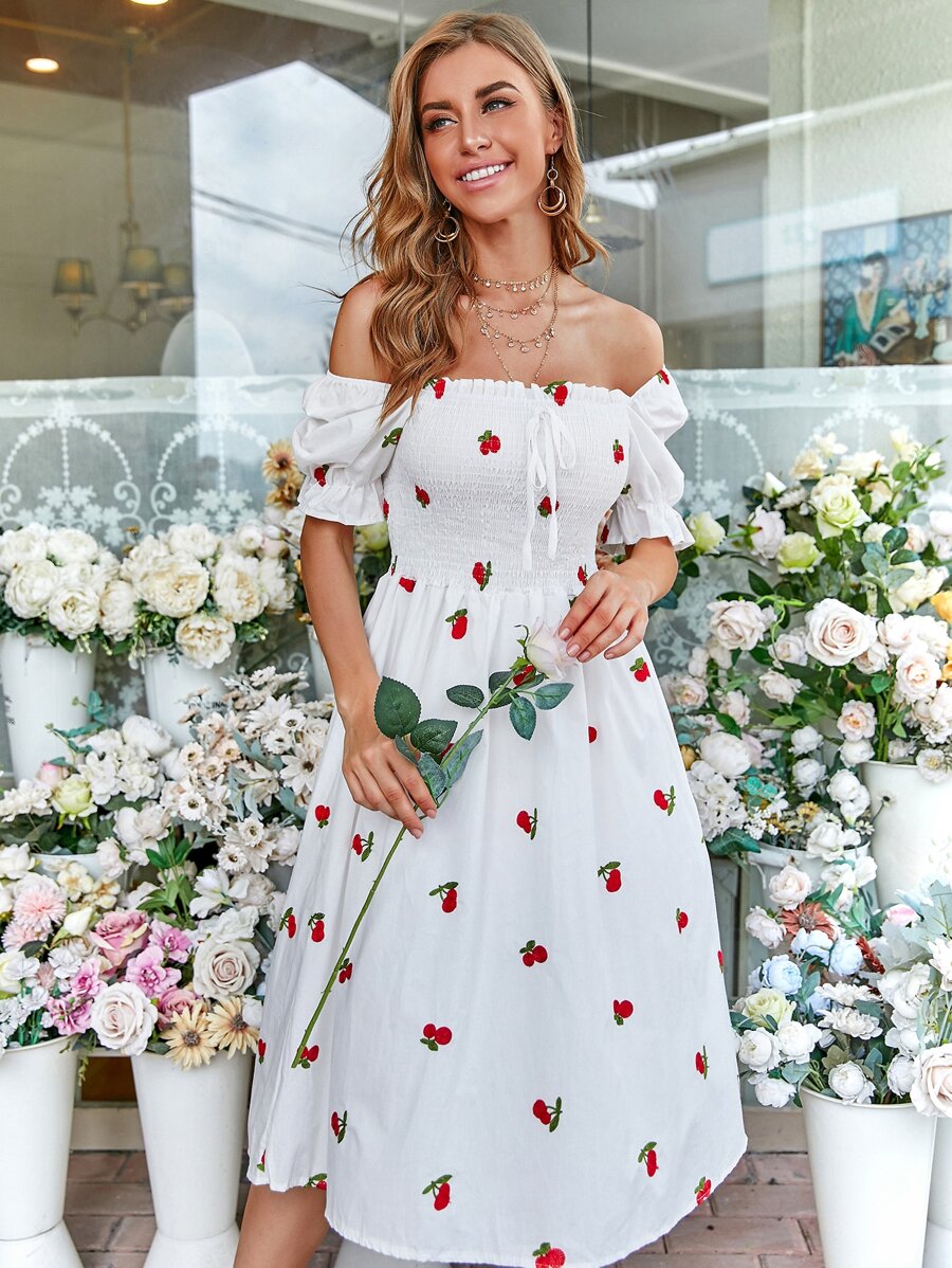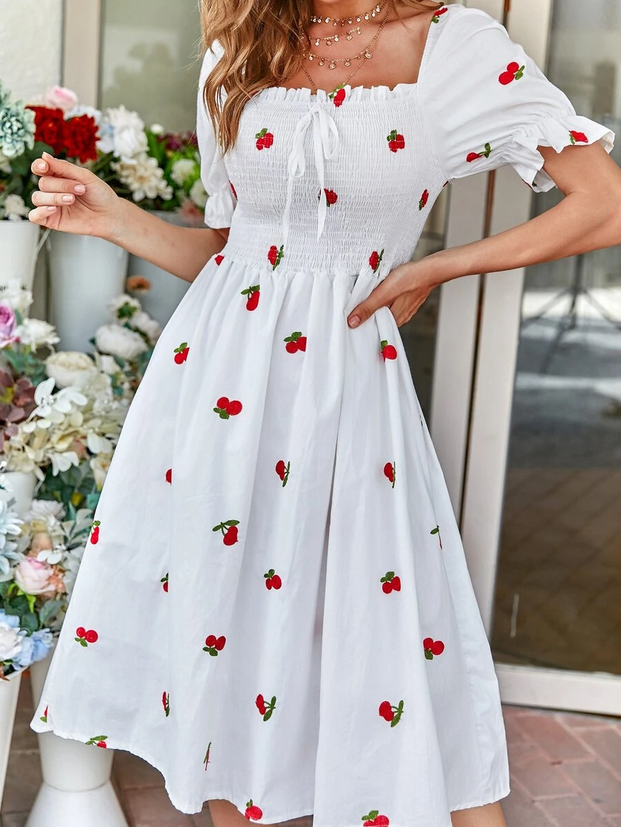 Cherry Embroidery Shirred Dress