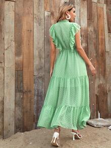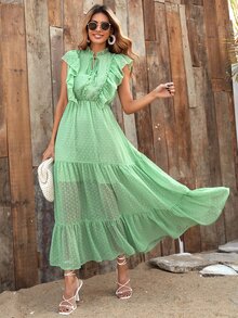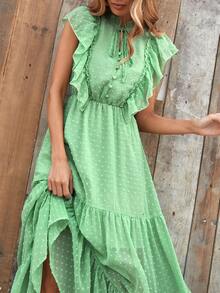 Chiffon Swiss Dot Tie Neck Ruffle Trim Dress