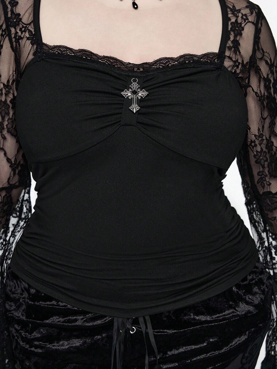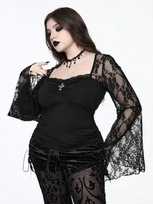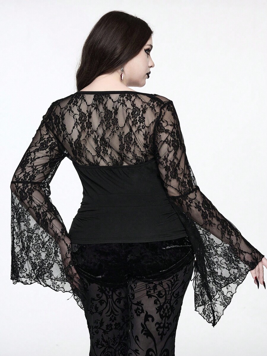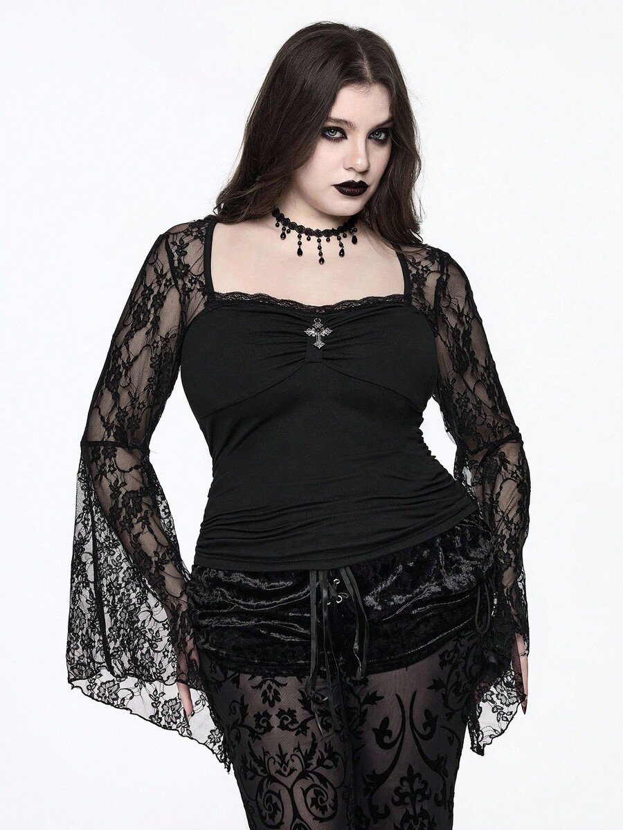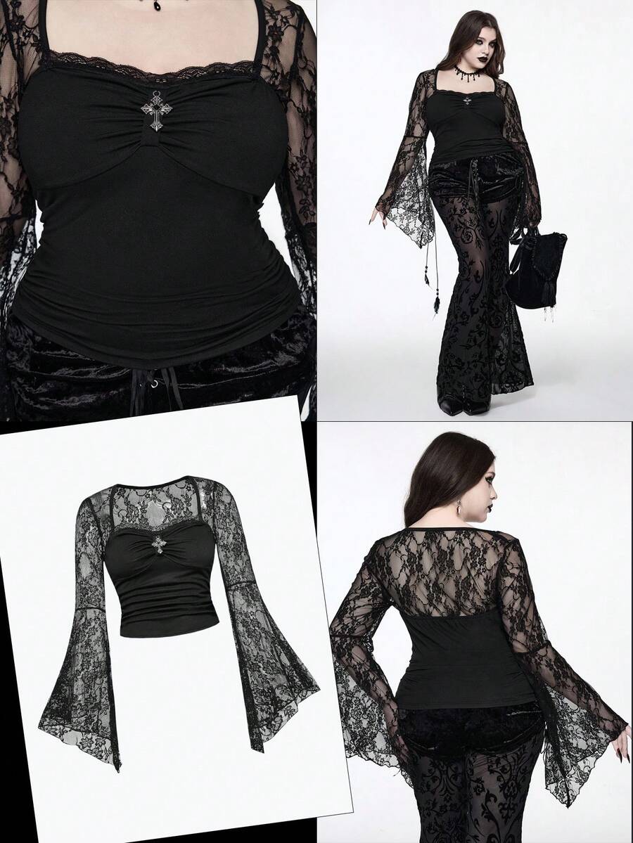 Christmas Gothic Cross Lace Patchwork Square Neck Flare Sleeve Women Top