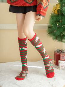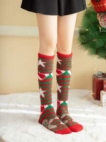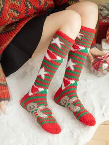 Christmas Star & Striped Pattern Fuzzy Over The Calf Socks