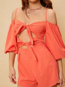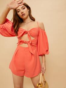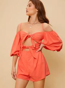 Cold Shoulder Lantern Sleeve Knot Front Romper