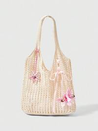 Fairycore 1pc Bohemian Style Beach Bag, Hollow Out Women's Handbag For Vacation, Comes With Strap Charm & Tropical Flower Decor
