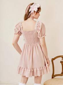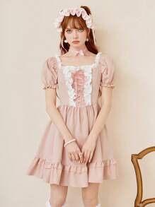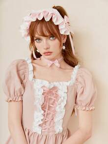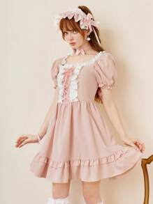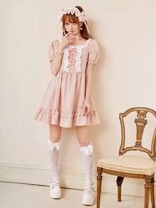 Colorblock Lace Up Front Puff Sleeve Ruffle Hem Dress