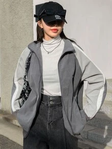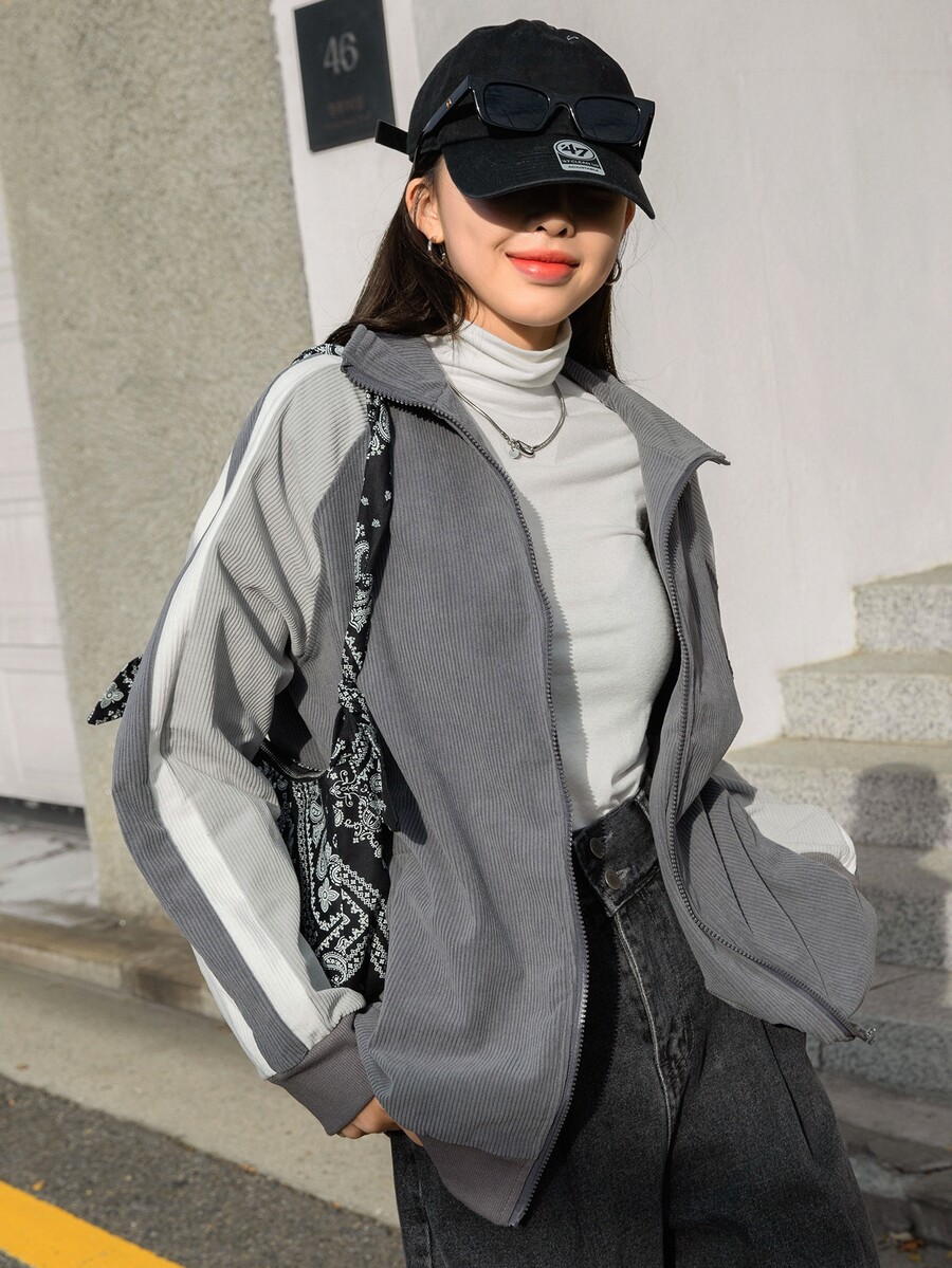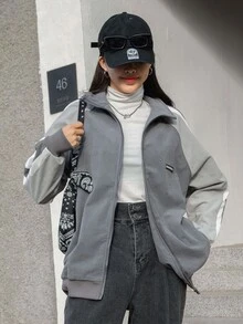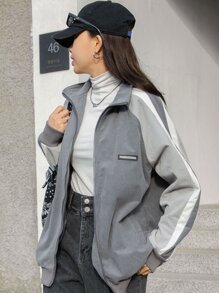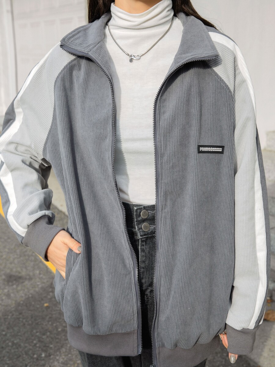 Colorblock Raglan Sleeve Letter Patched Detail Corduroy Jacket