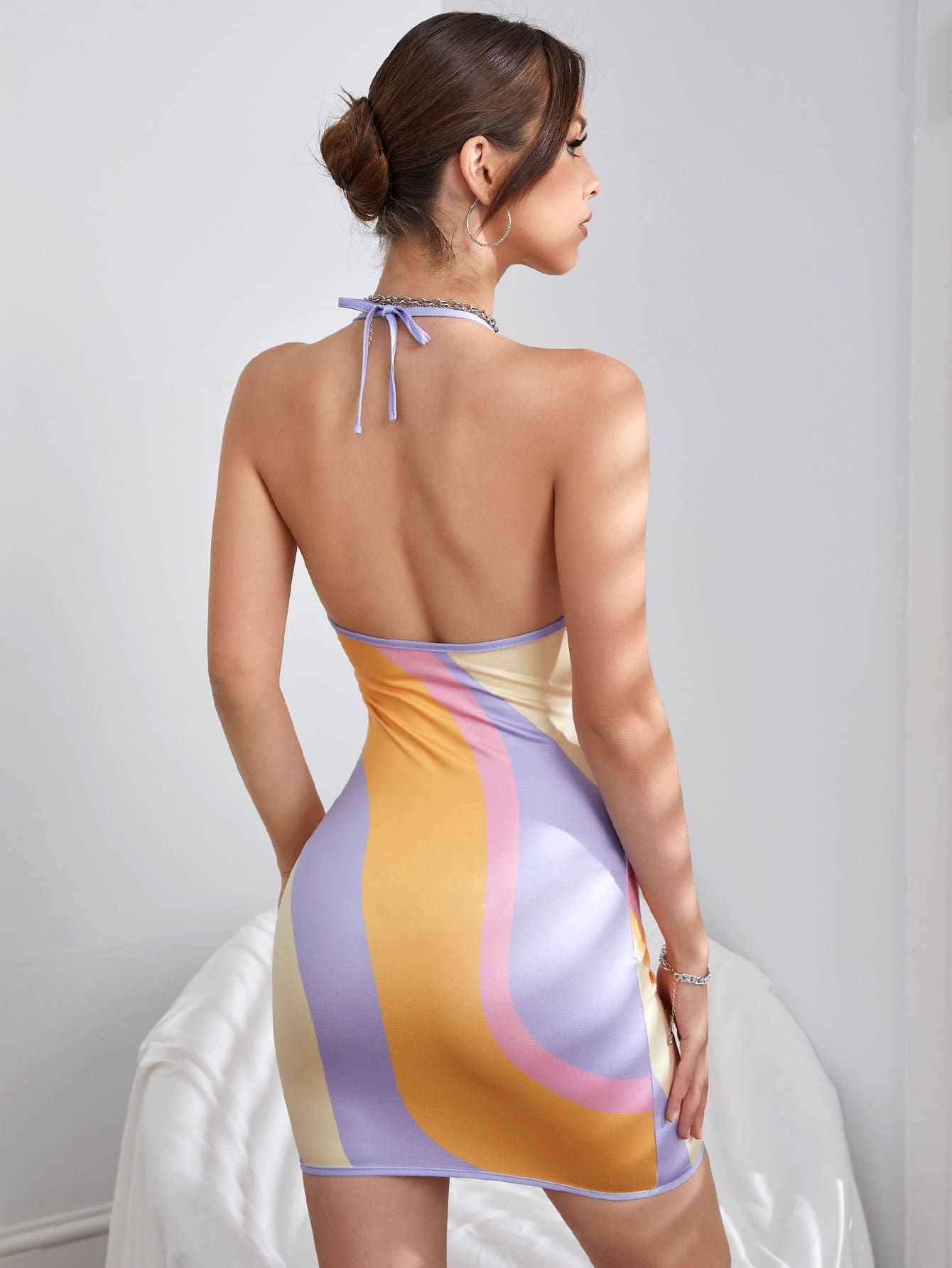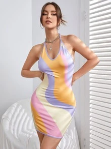 Colorblock Tie Backless Halter Bodycon Dress