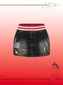 Astro Boy X ROMWE Colorblock Vintage Distressed Women Denim Mini Skirt