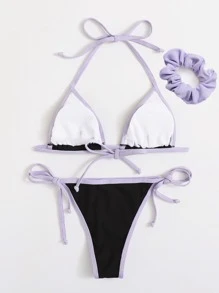 Contrast Binding Tie Side Bikini Set & Scrunchie Summer Beach