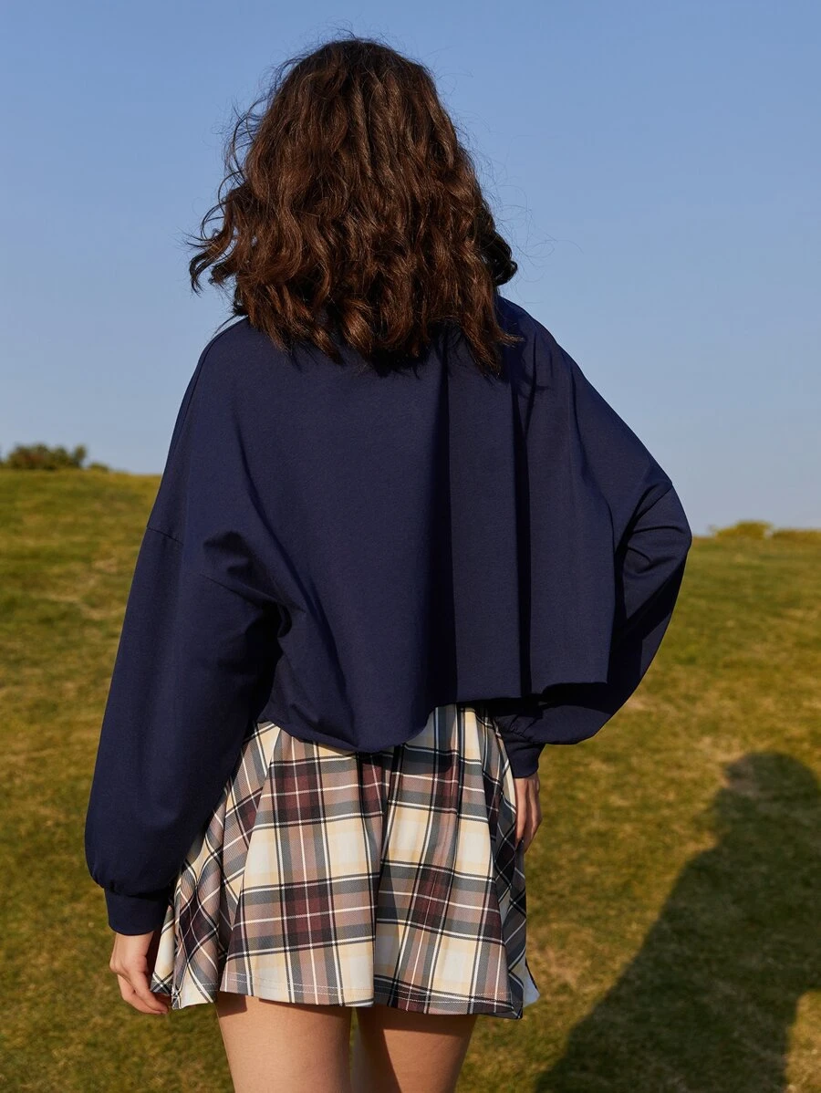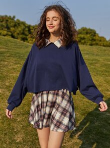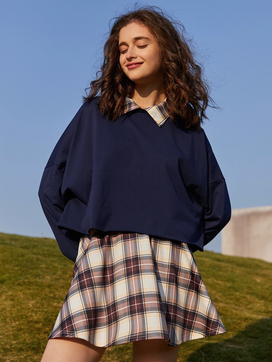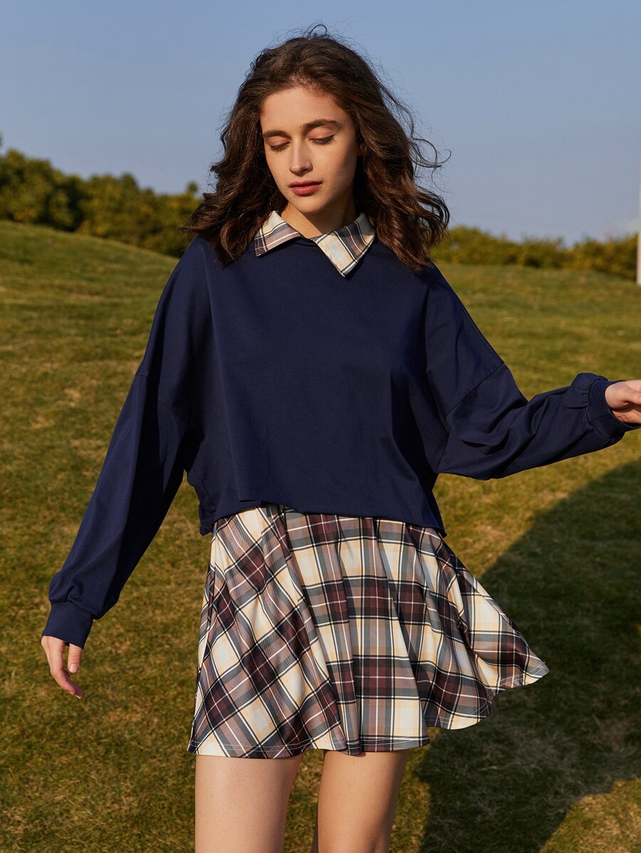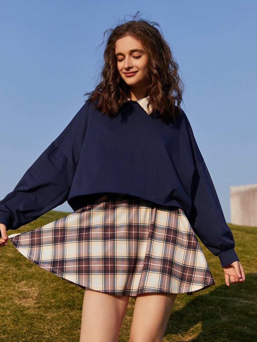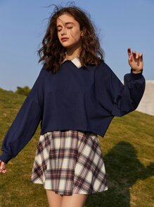 Contrast Collar Sweatshirt & Plaid Skirt