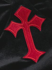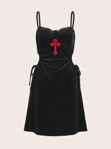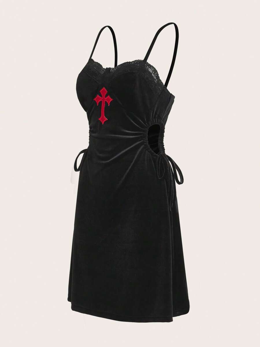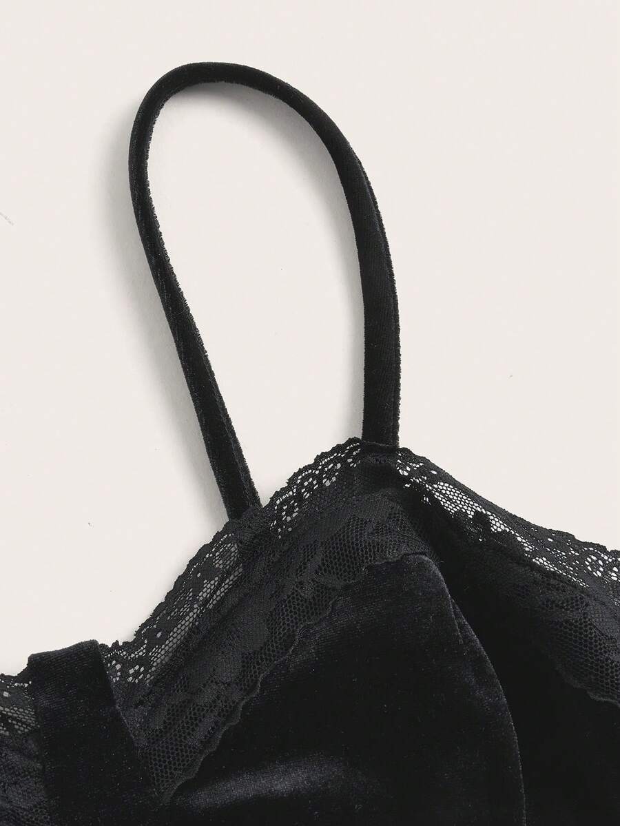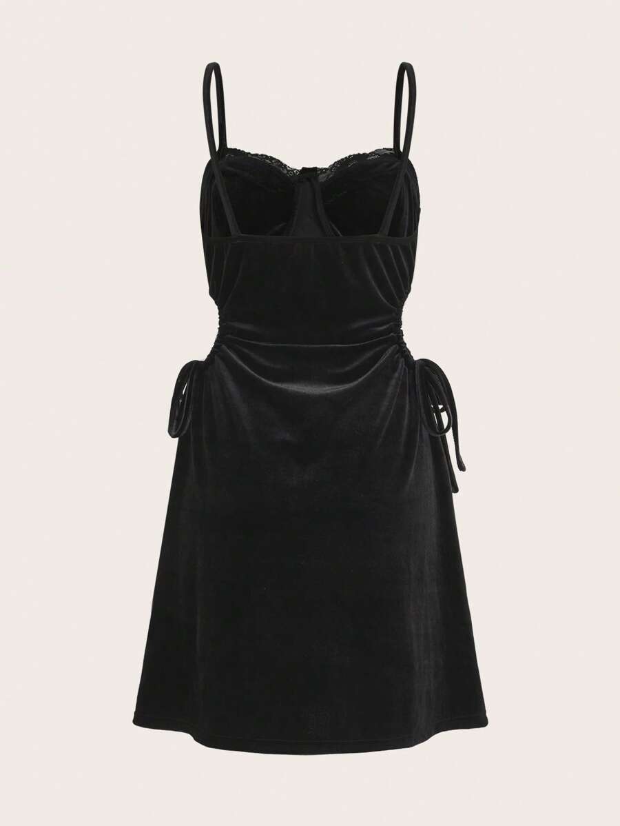 Contrast Lace Cut Out Drawstring Velvet Cami Dress