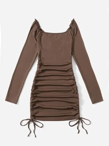 Contrast Lace Drawstring Ruched Ribbed Dress