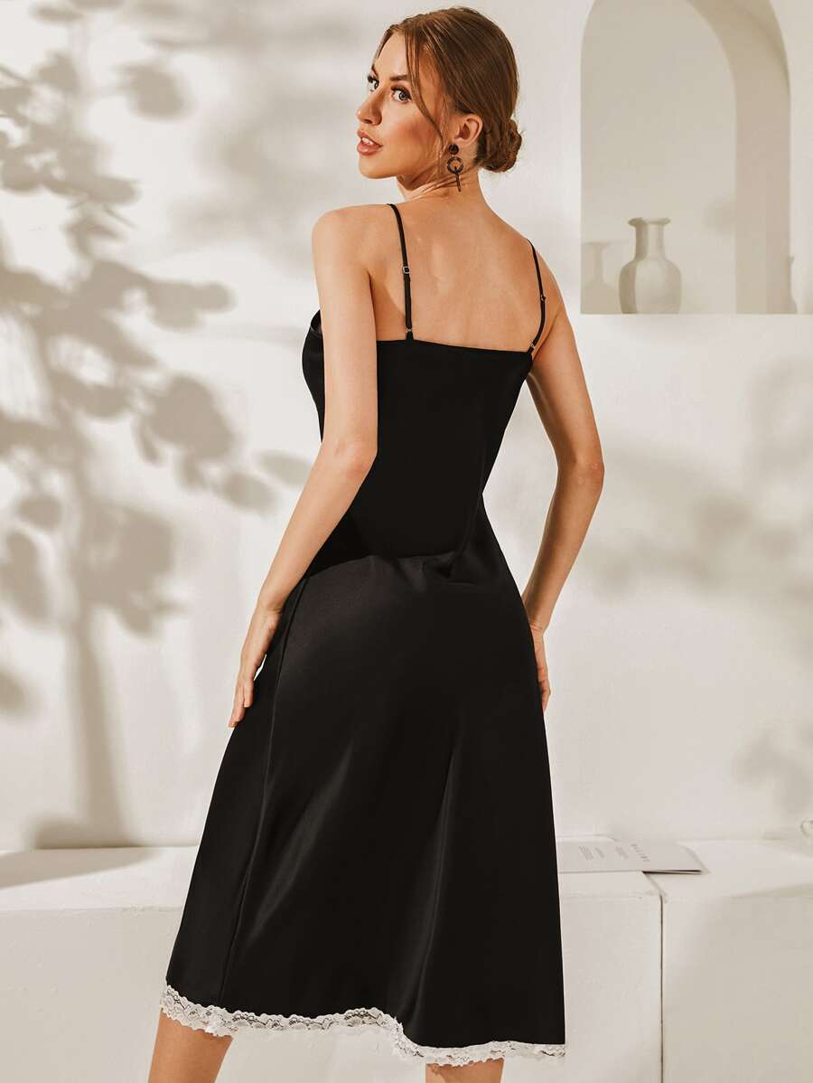 Contrast Lace Trim Split Thigh Satin Cami Nightdress
