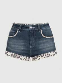 Contrast Leopard Print Roll Up Hem Denim Shorts For Summer