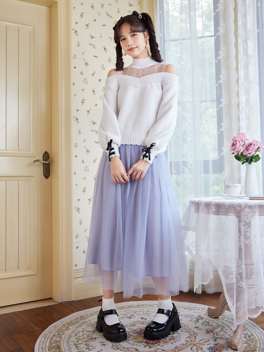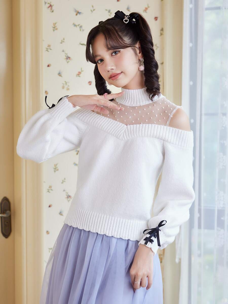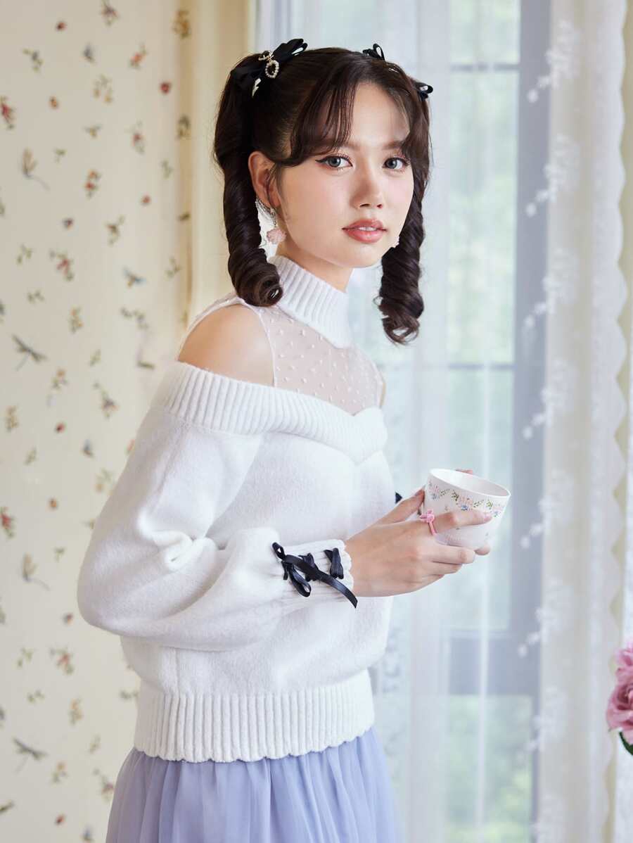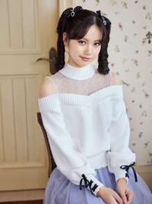 Kawaii Contrast Mesh Lace Up Sleeve Sweater