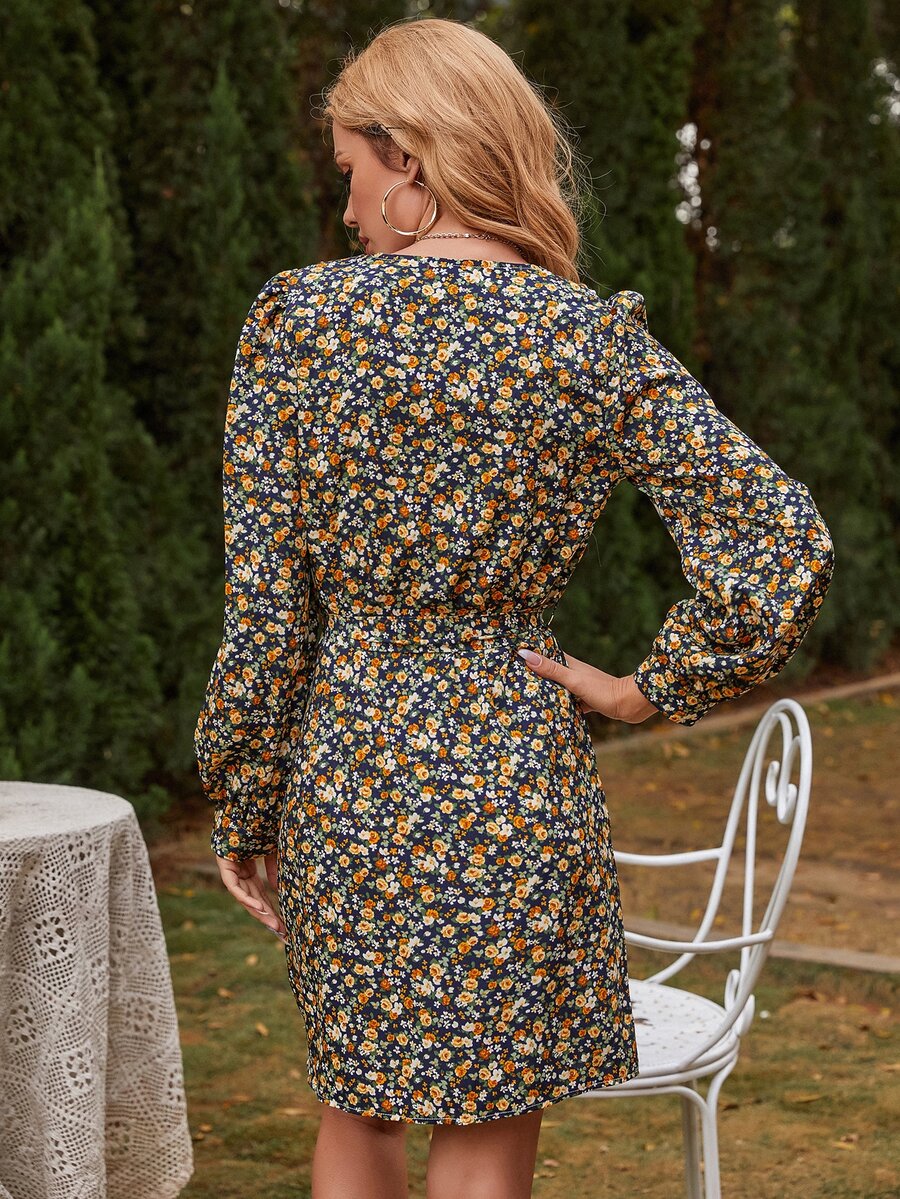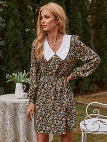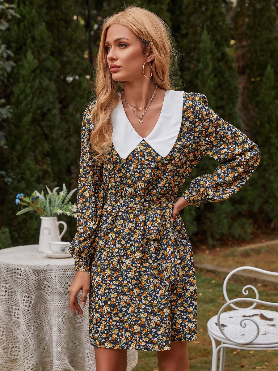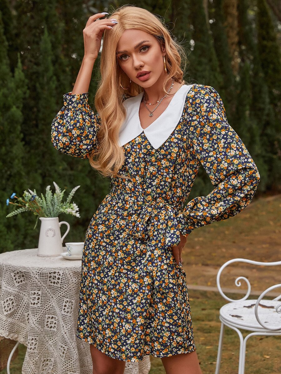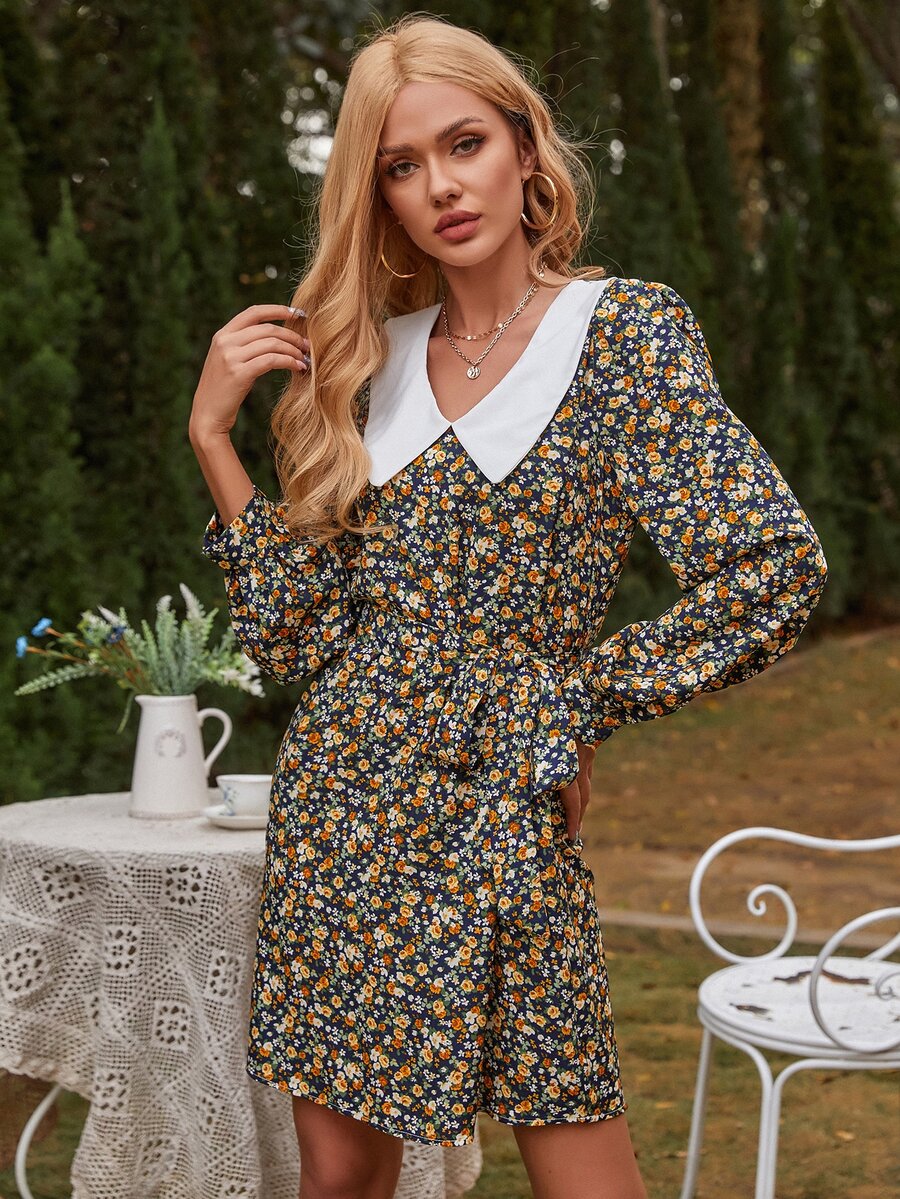 Contrast Peter Pan Collar Ditsy Floral Belted Dress