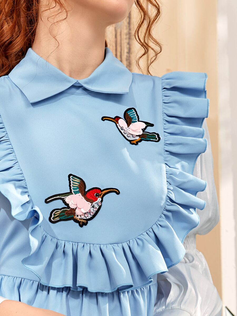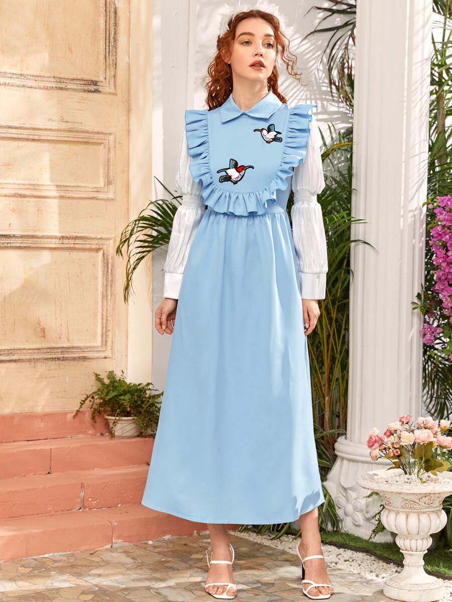 Contrast Sleeve Bird Embroidery Ruffle A-line Dress
