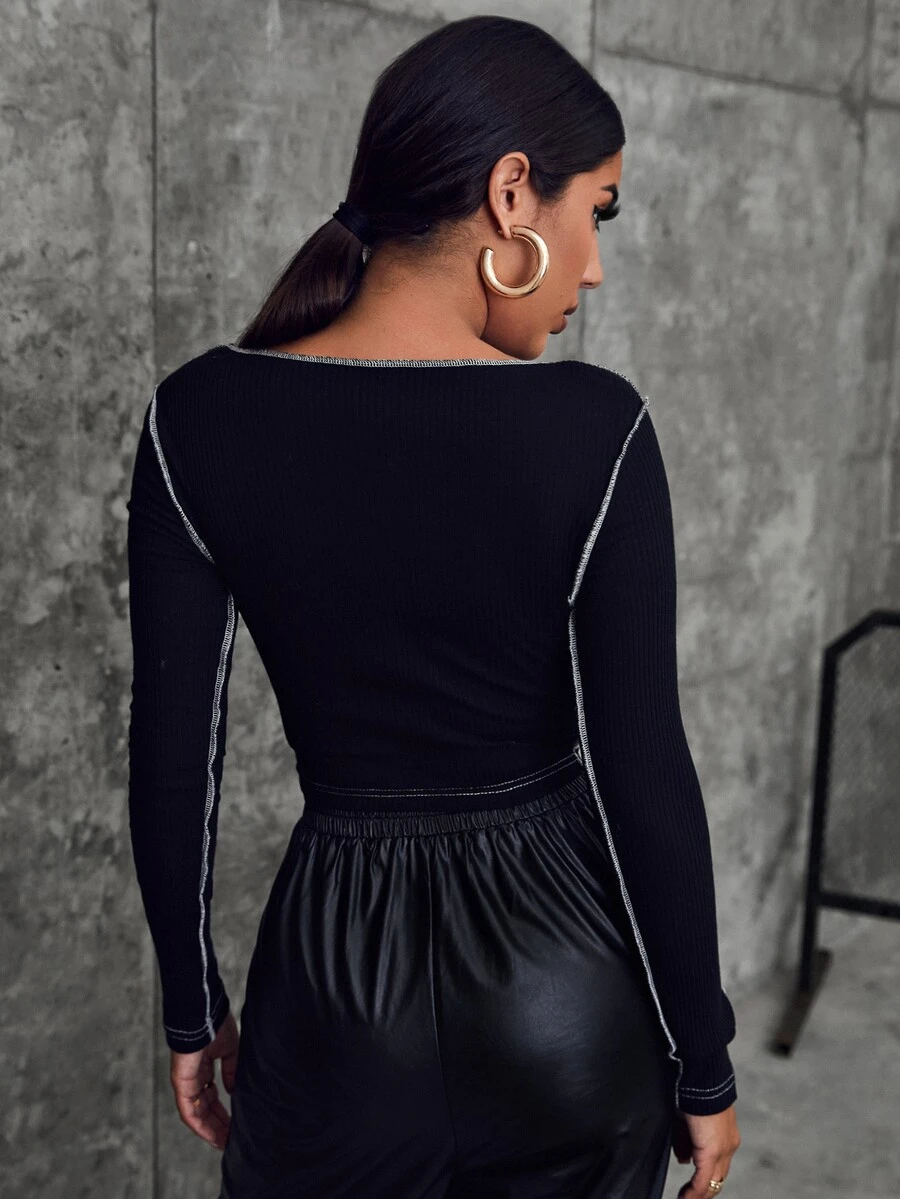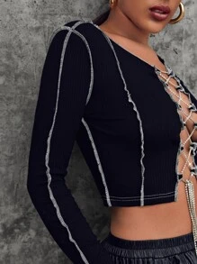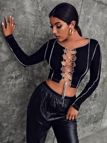 Contrast Stitch Rhinestone Chain Lace-up Front Crop Top