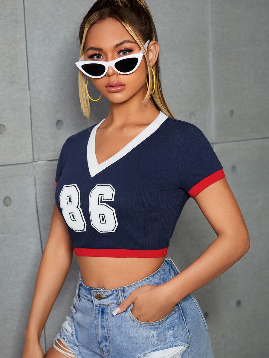 Contrast Trim Number Print Crop Top