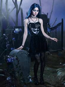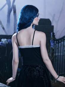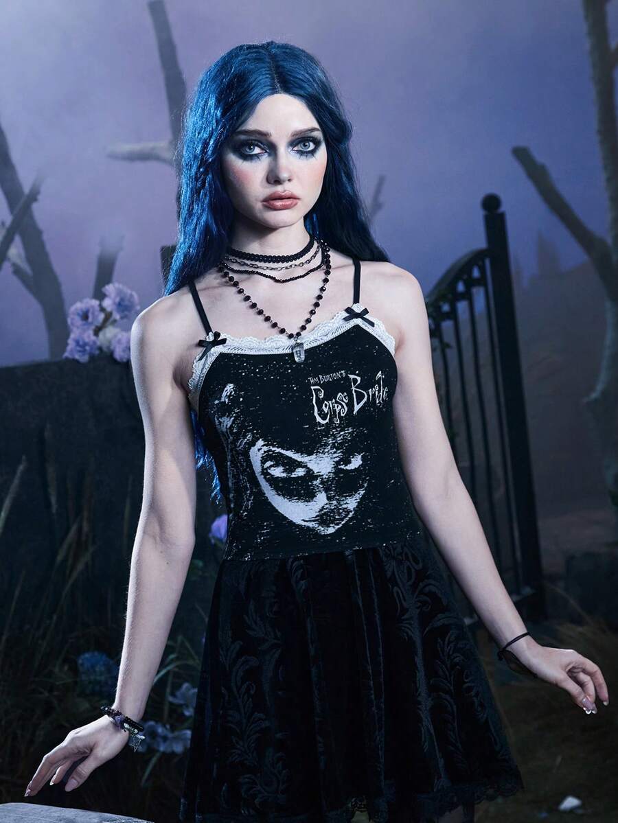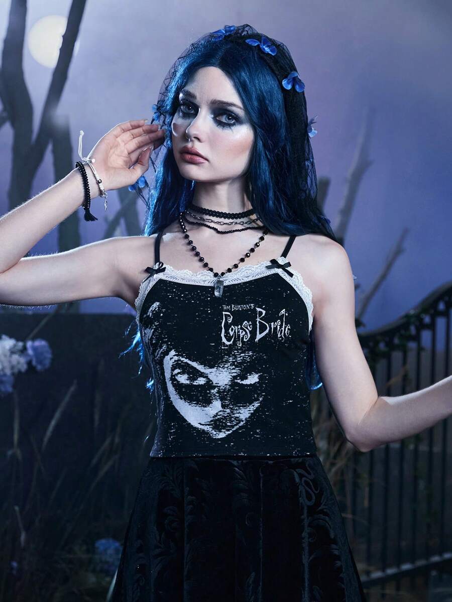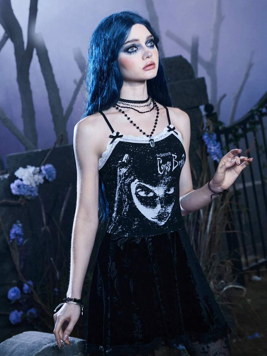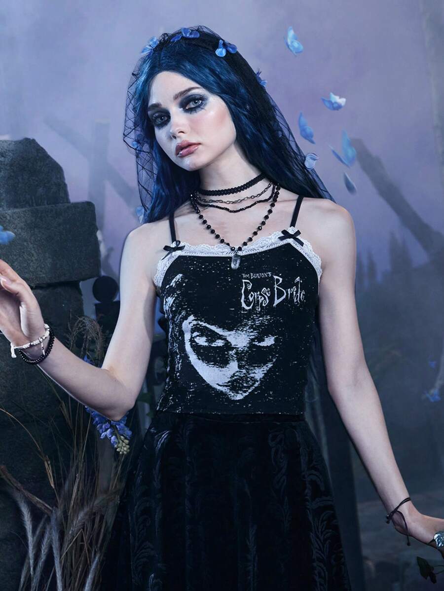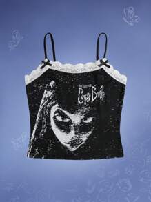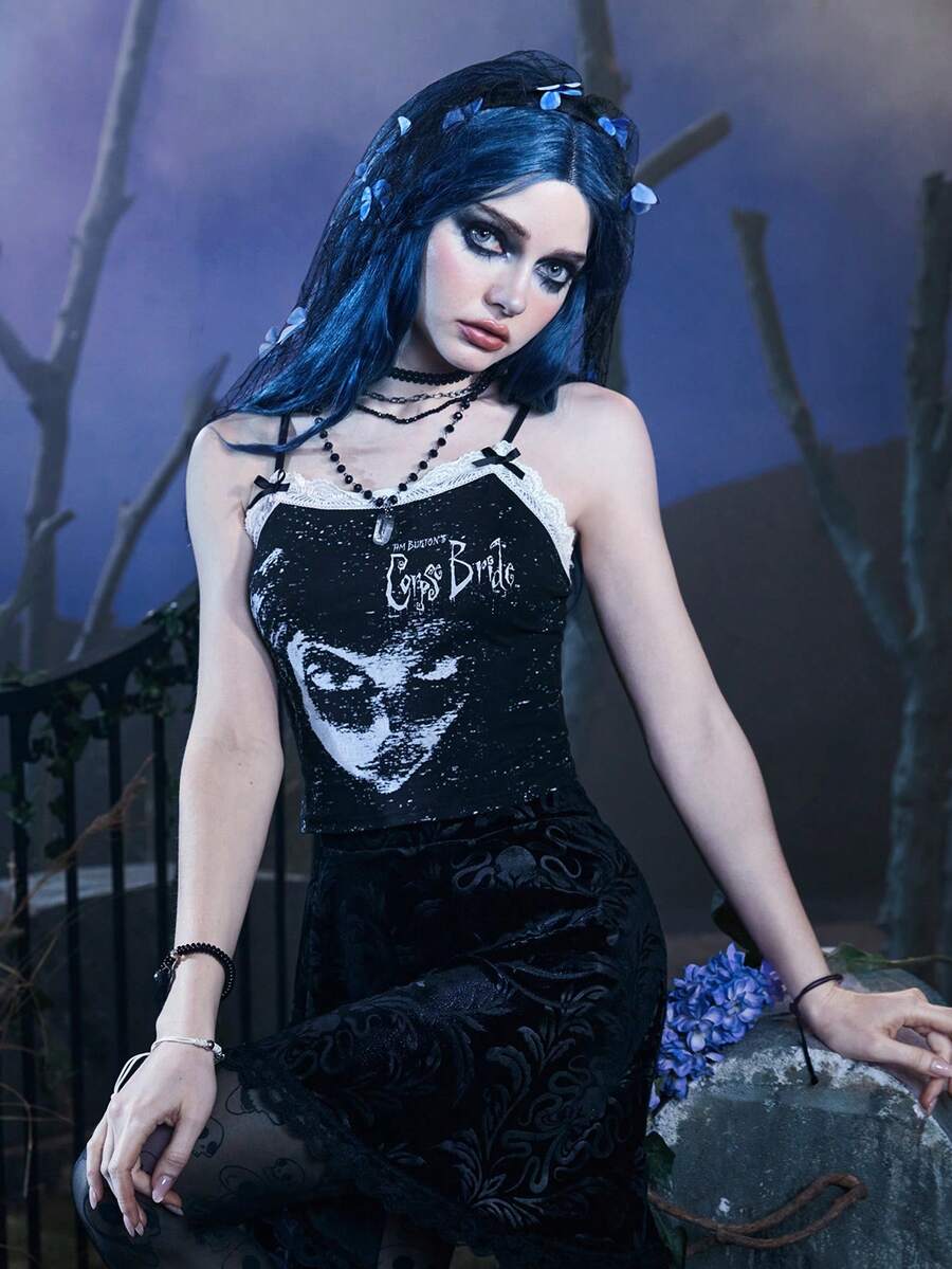 Corpse Bride | ROMWE Figure Graphic Contrast Lace Cami Top Gothic