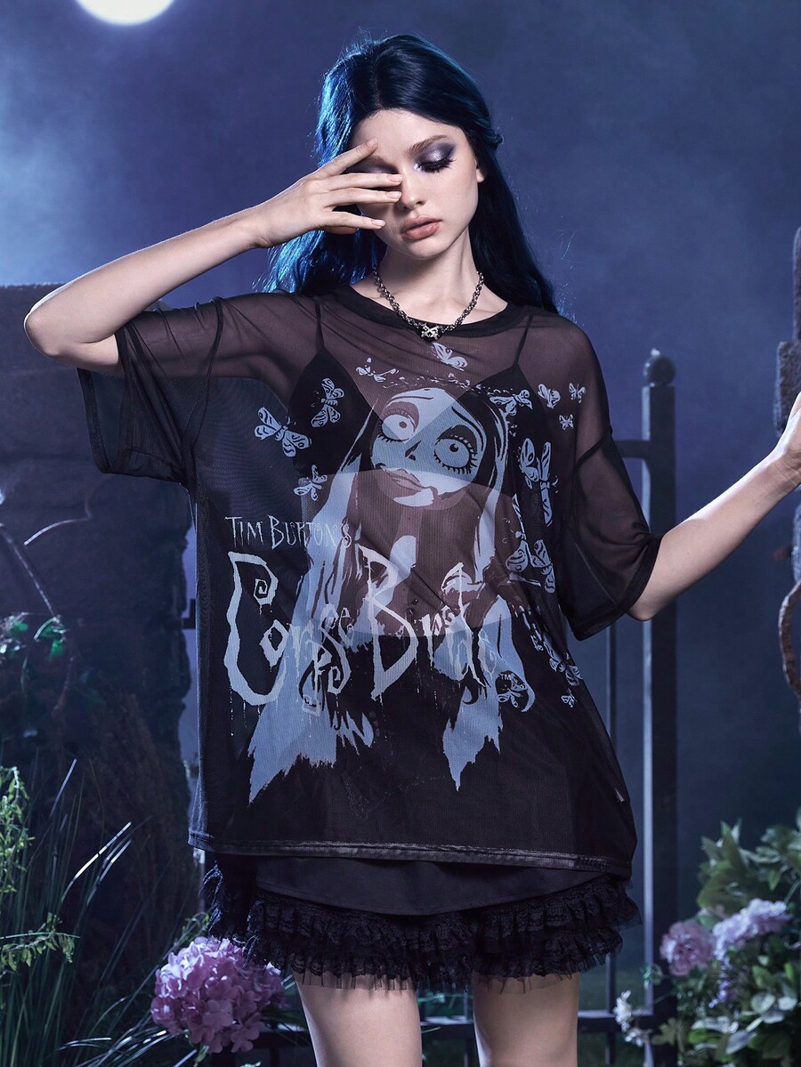 Corpse Bride | ROMWE Figure Graphic Drop Shoulder Mesh Top