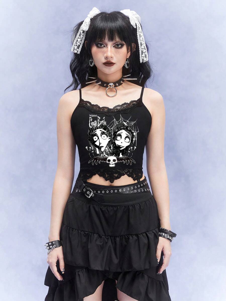 Corpse Bride | ROMWE Gothic Figure Patterned Contrast Lace Slim Fit Crop Camisole Top, School
