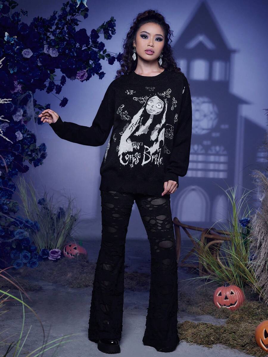 Corpse Bride | ROMWE Letter Figure & Butterfly Pattern Drop Shoulder Sweater