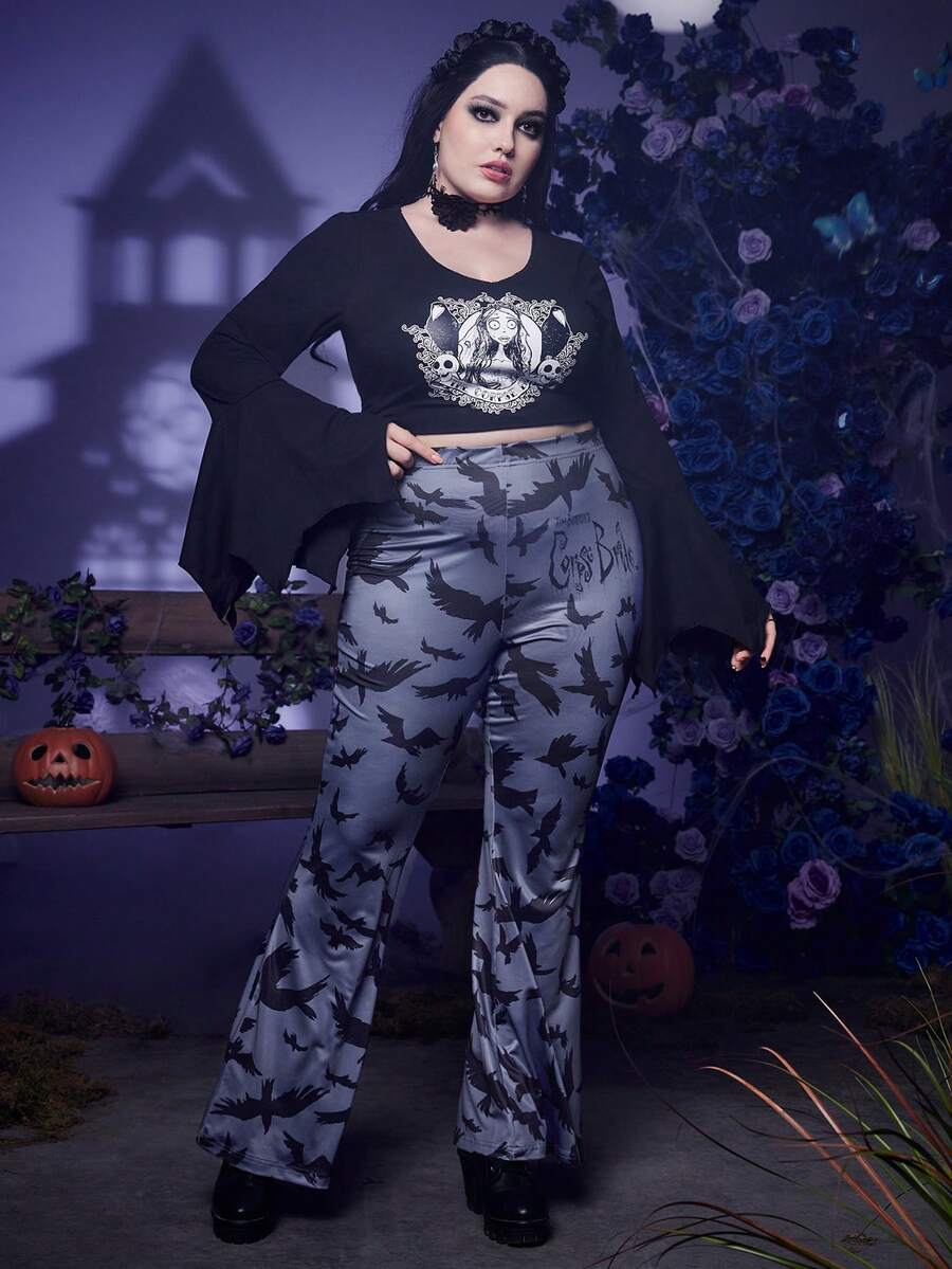 Corpse Bride | ROMWE Plus High Waist Bird Print Flare Leg Pants