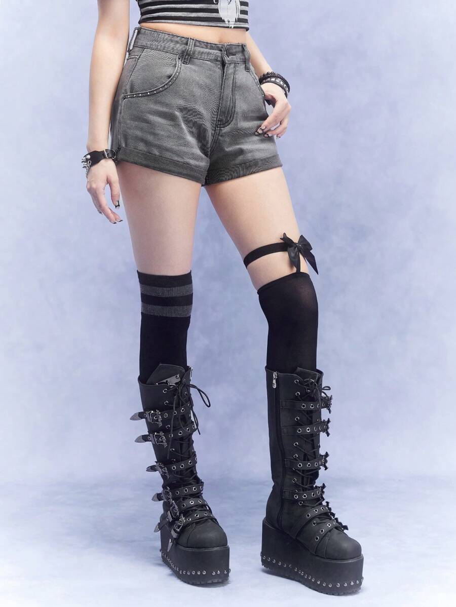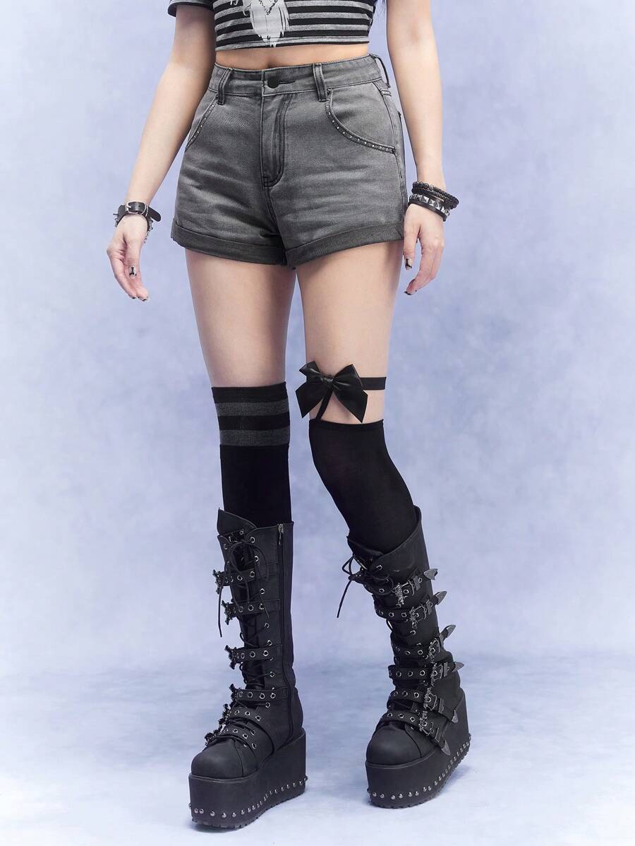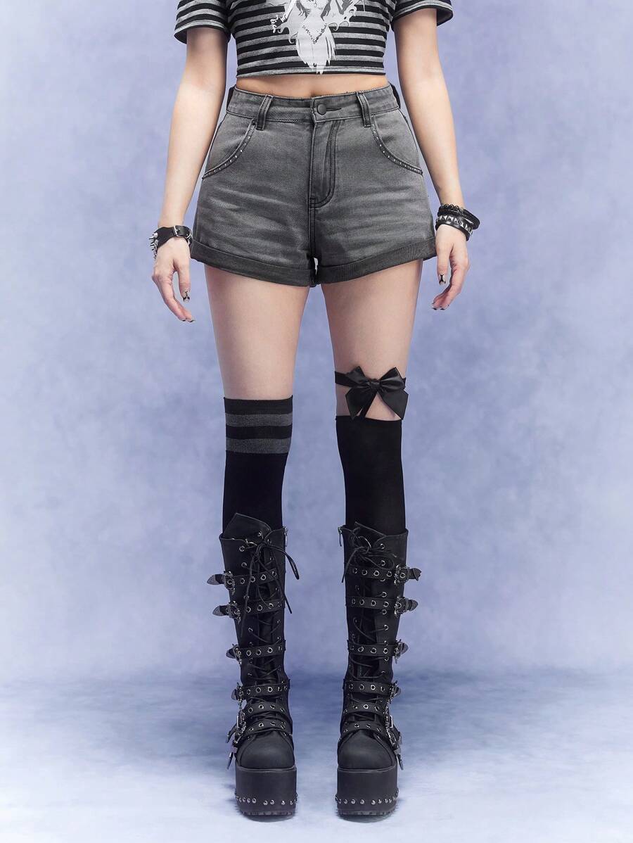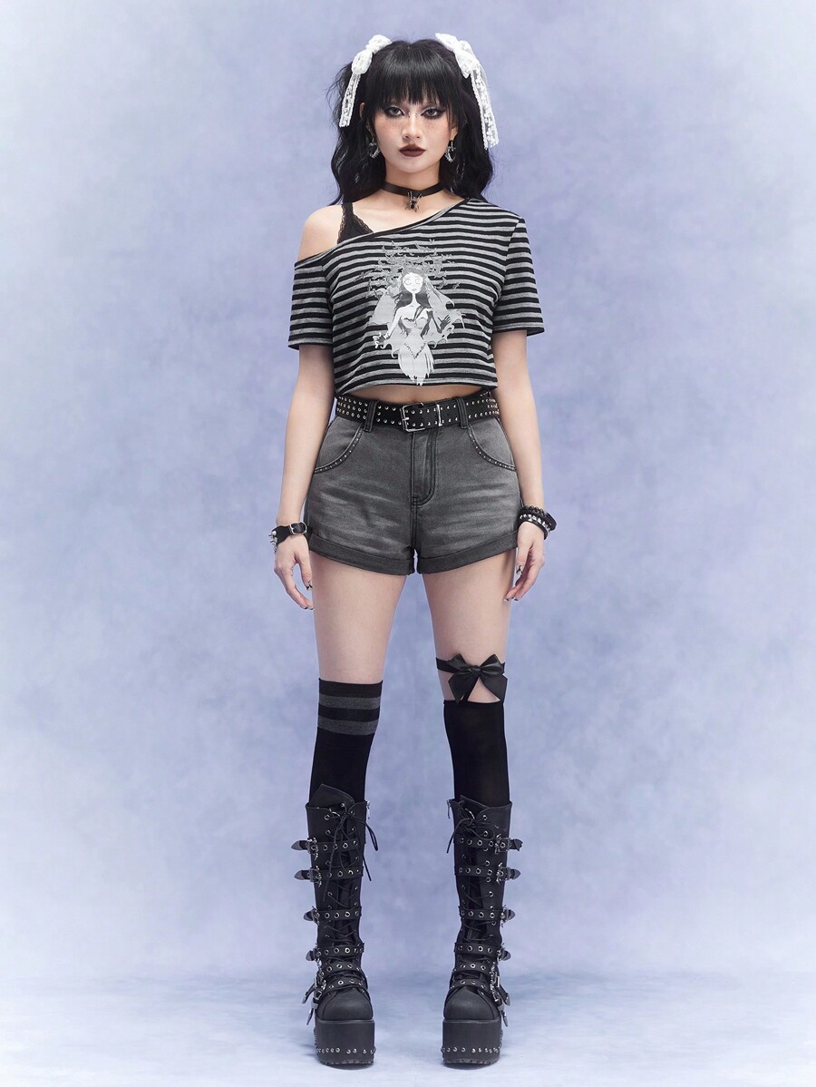 Corpse Bride | ROMWE Women's Cartoon Figure & Letter Embroidered Cuffed Hem Denim Shorts Without Belt, School