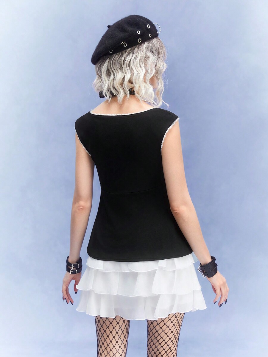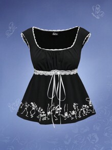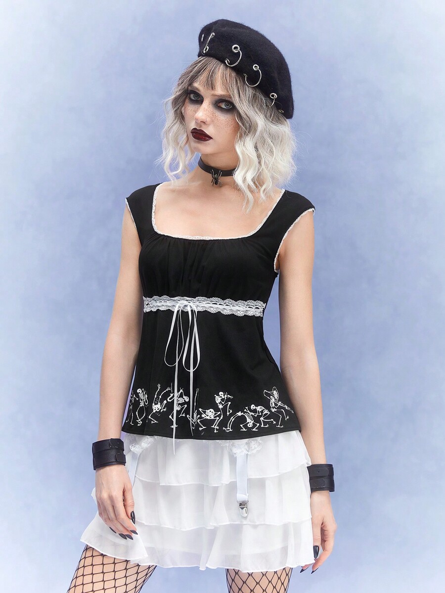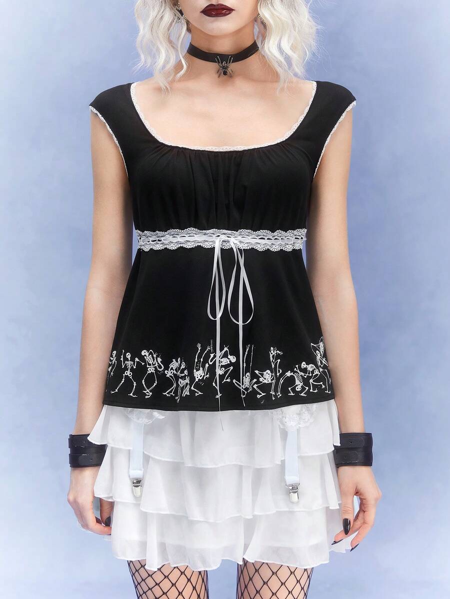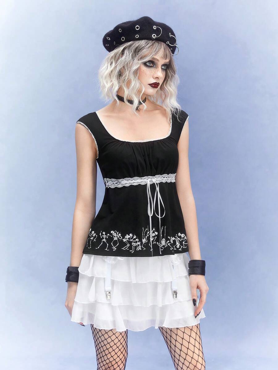 Corpse Bride | ROMWE Women's Contrast Lace Skull Pattern T-Shirt, School