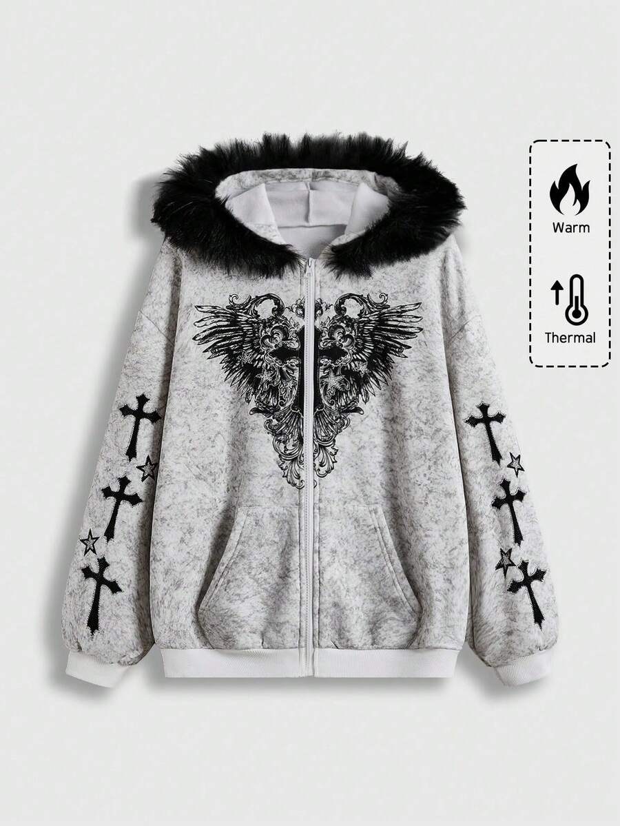 Fairycore Cross & Wing Print Rhinestone Wash Distressed Fuzzy Hoodie Graduation,Back To School Outfits,Graduation,Teacher Outfits For Women,Back To School