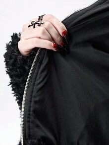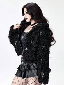 Goth Cross Decor Fuzzy Zipper Long Sleeve Casual Women Jackets