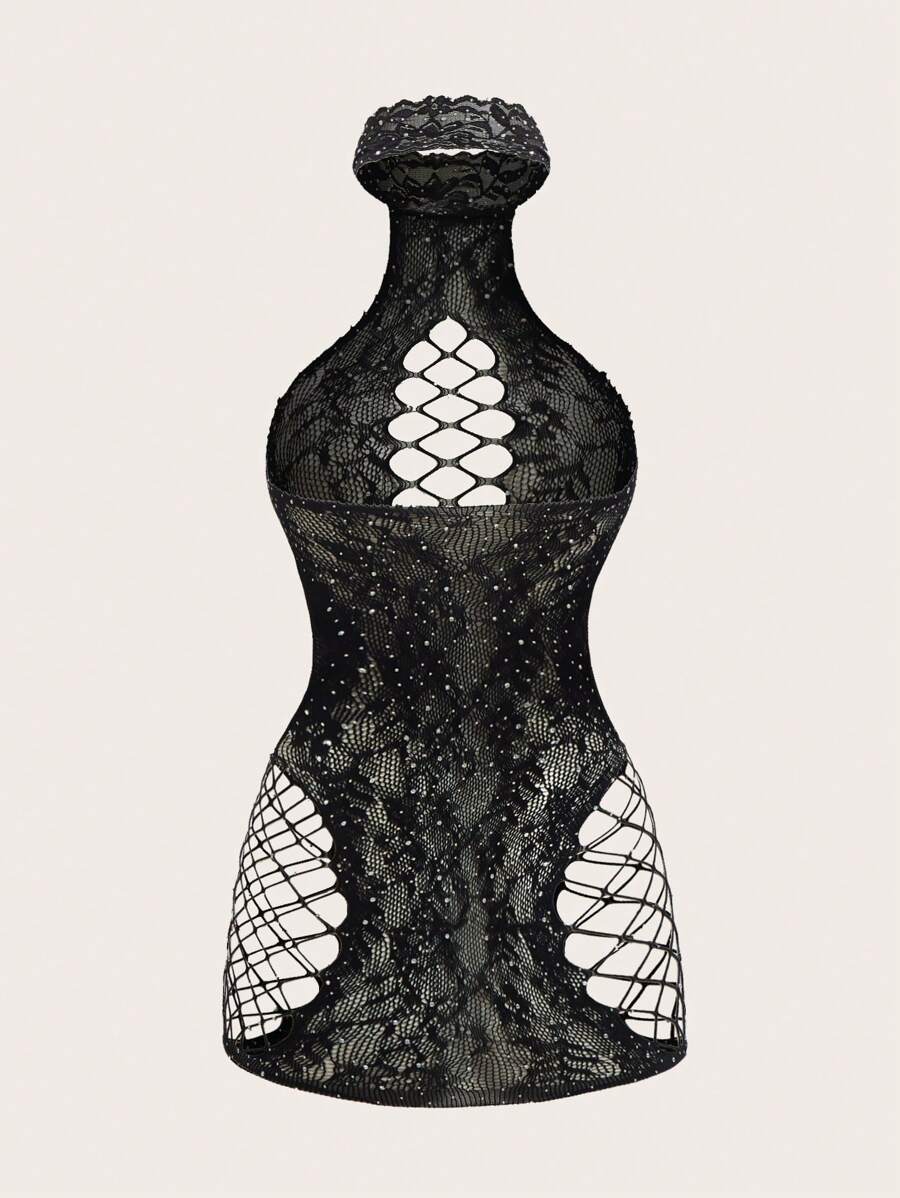Cut Out Fishnet Rhinestone Decor Halter Slips
