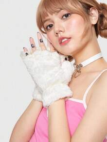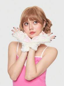Kawaii Cute Cartoon Cat Paw Embroidered Fingerless Gloves, Warm Plush Half Finger Gloves For Cosplay, Casual Outdoor Use In Autumn/Winter