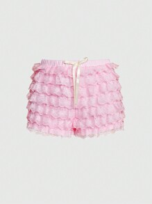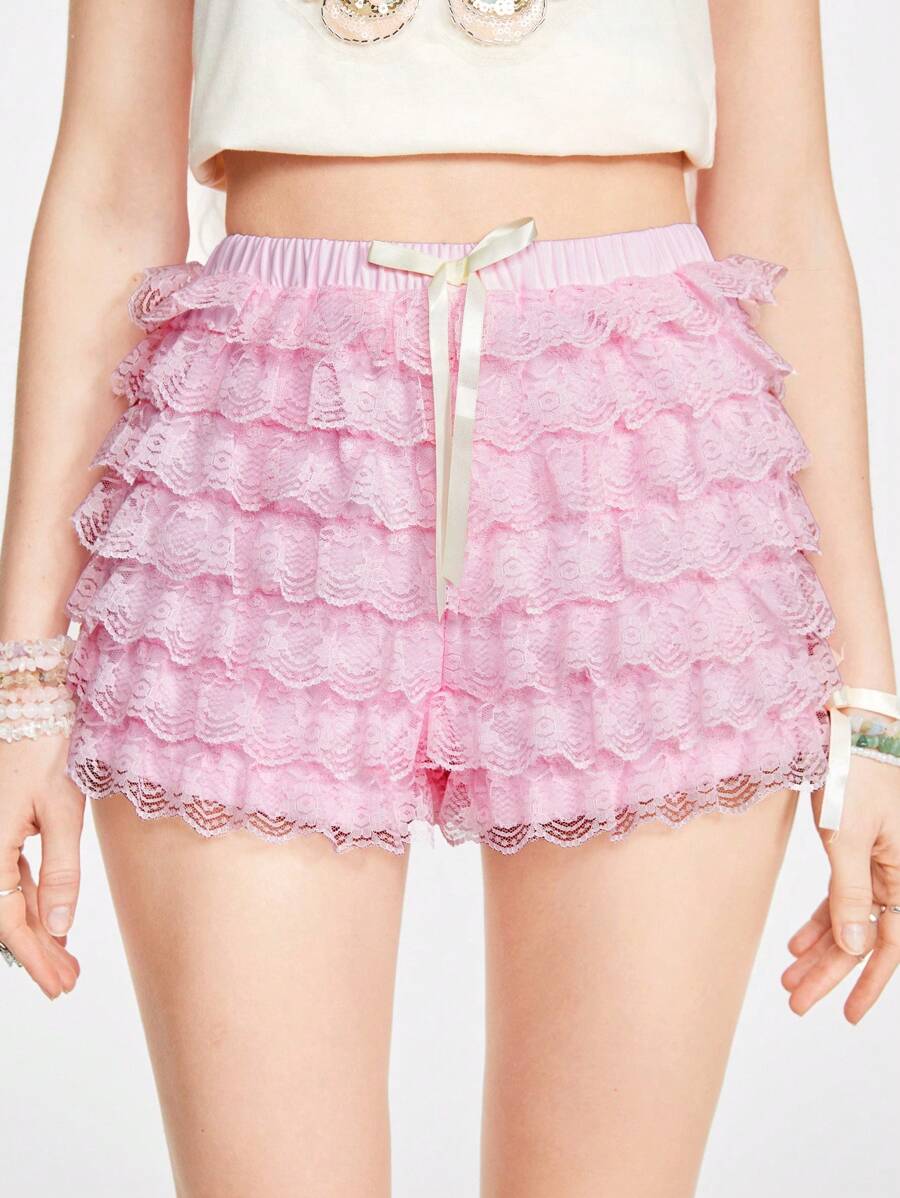 Cute Kawaii Pink Lace Layered Bowknot Decor Mini Women Shorts