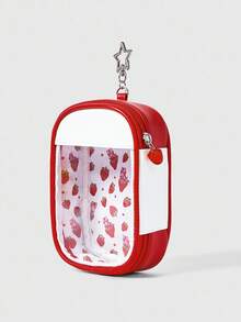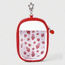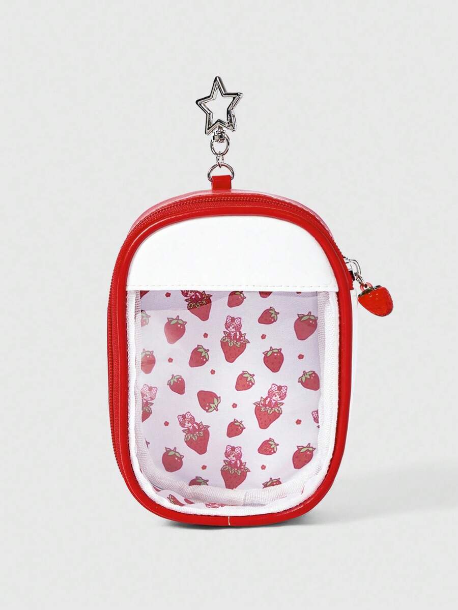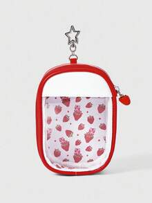 Kawaii Cute Strawberry Print Transparent Small Pouch With Star Shaped Hook, Portable Cosmetic Bag