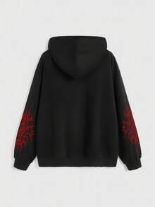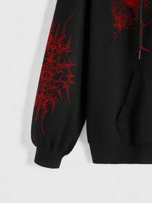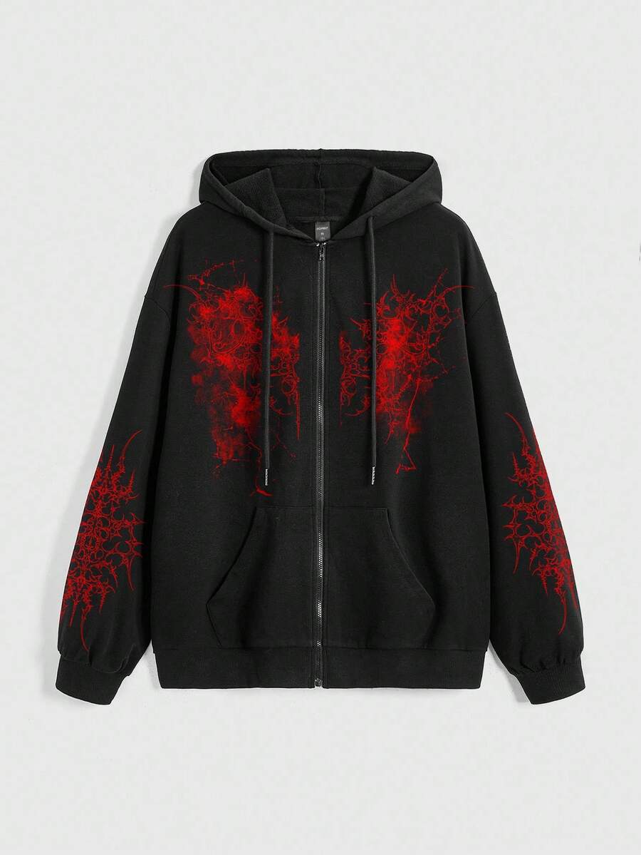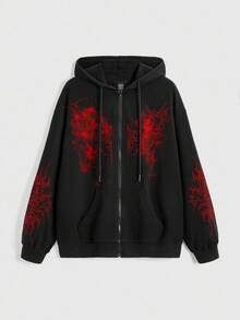 Grunge Punk Dark Punk Style Red Thorn Vintage Zip-Up Black Graphic Pocket Hoodie For Women, Autumn/Winter