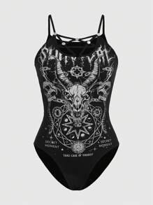 Women Dark Sexy Gothic Skeleton & Horns Printed Star Detail Cami Bodysuit