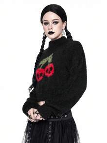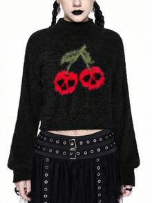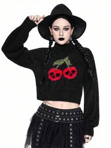 Goth Dark Skull & Cherry Print Knitted Long Sleeve Pullover Knit Top, Halloween
