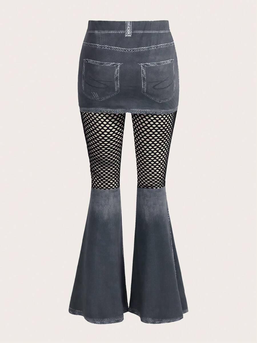 Denim-Effect Print Ripped Frayed Contrast Fishnet Flare Leg Pants Without Belt