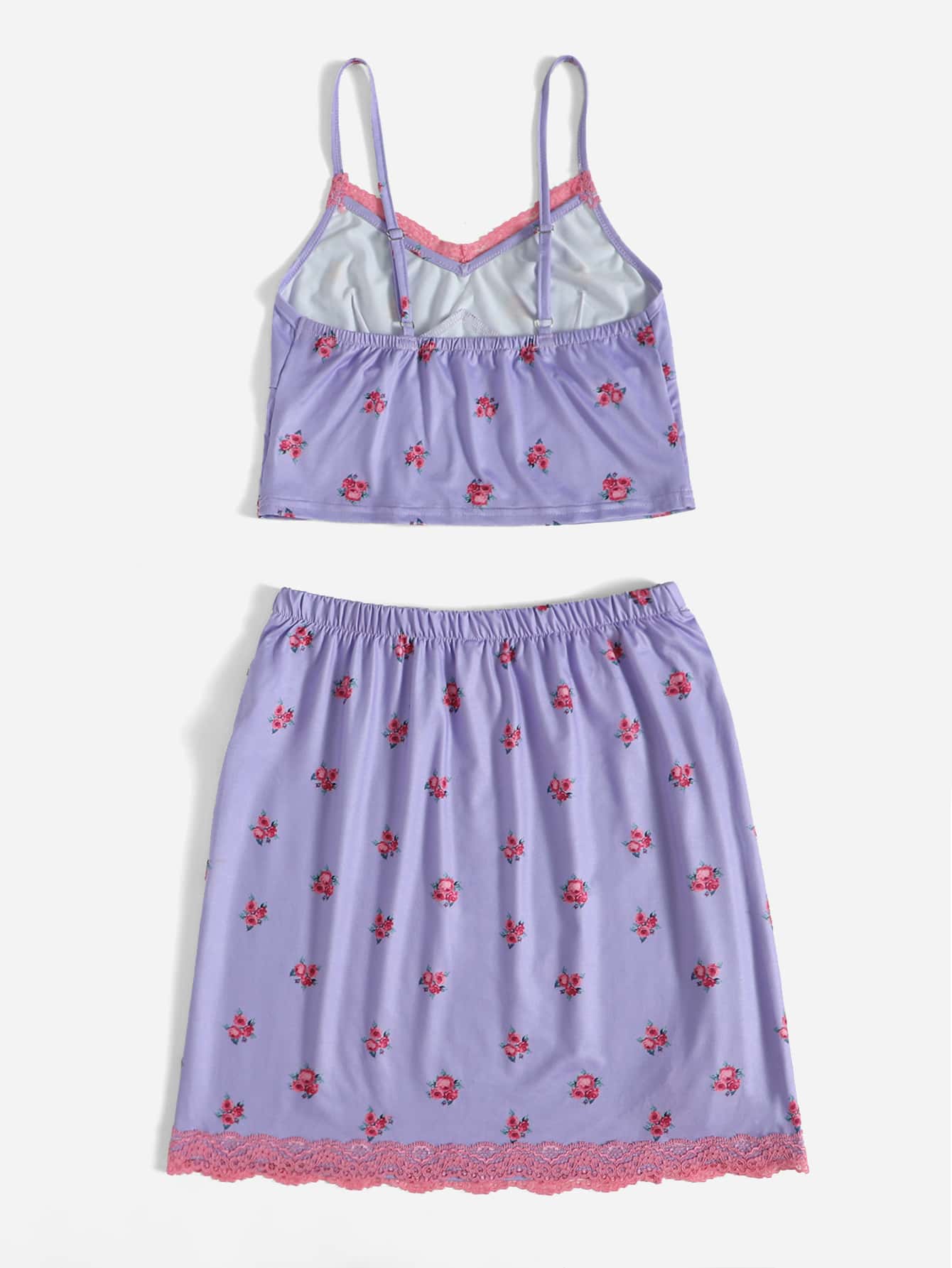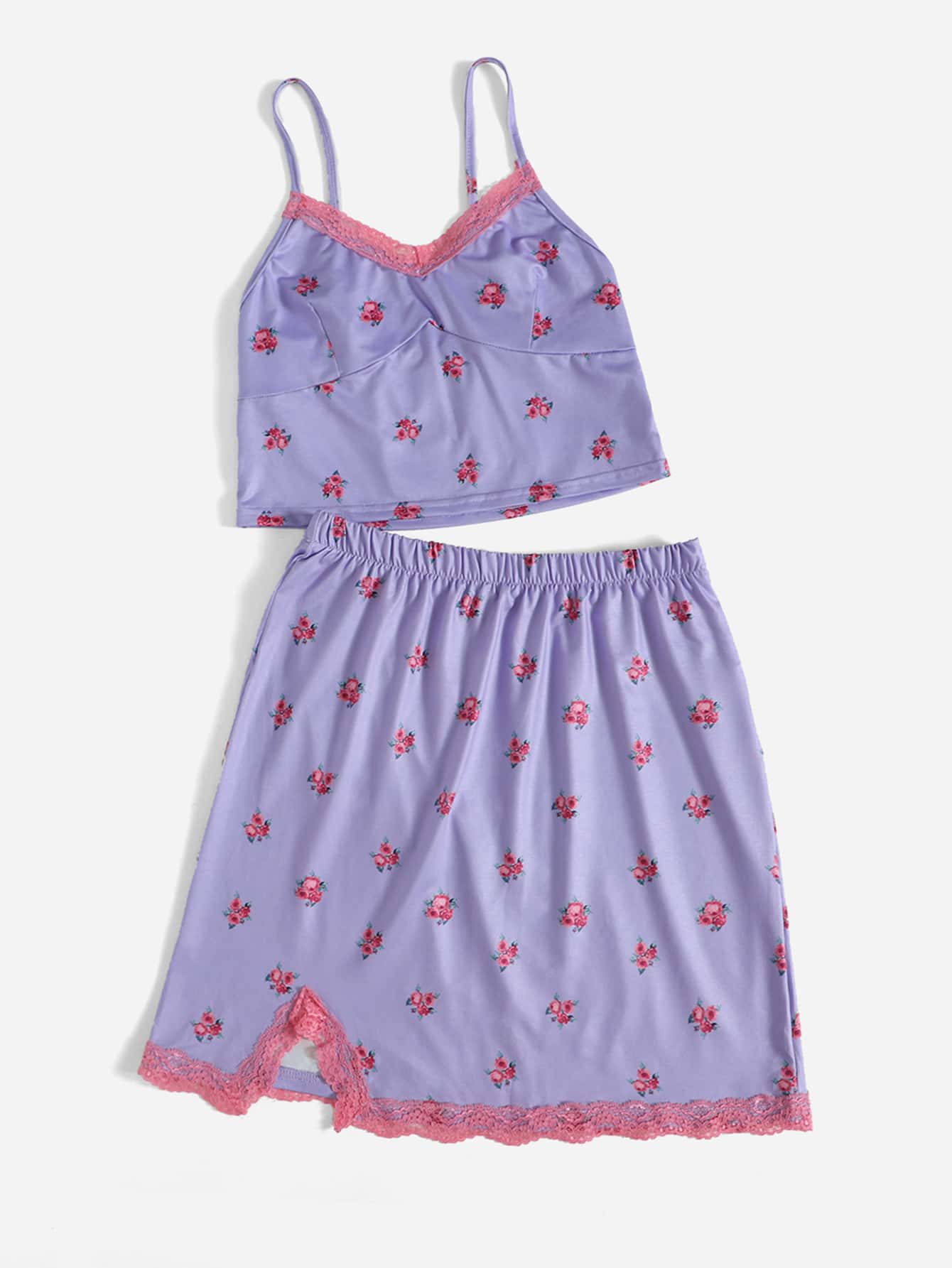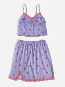 Ditsy Floral Contrast Lace Crop Cami & Split Skirt