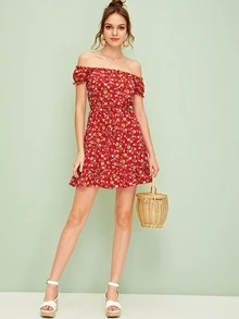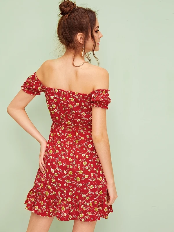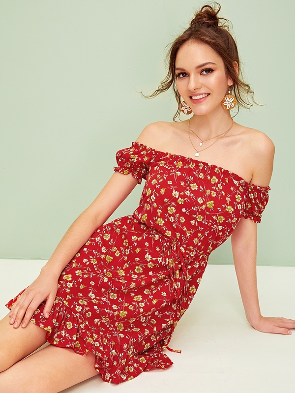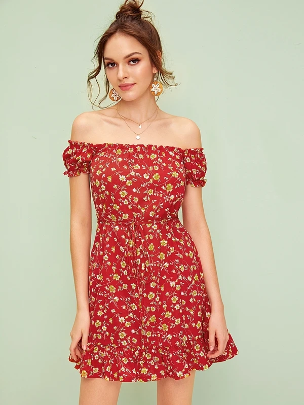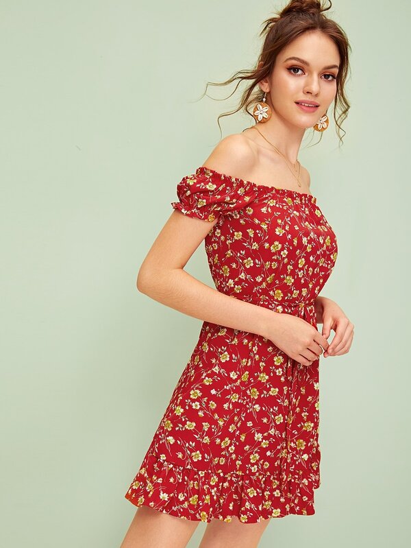 Ditsy Floral Off The Shoulder Ruffle Hem Dress