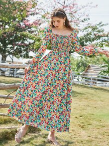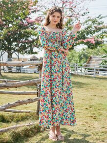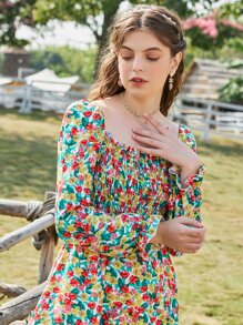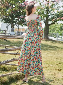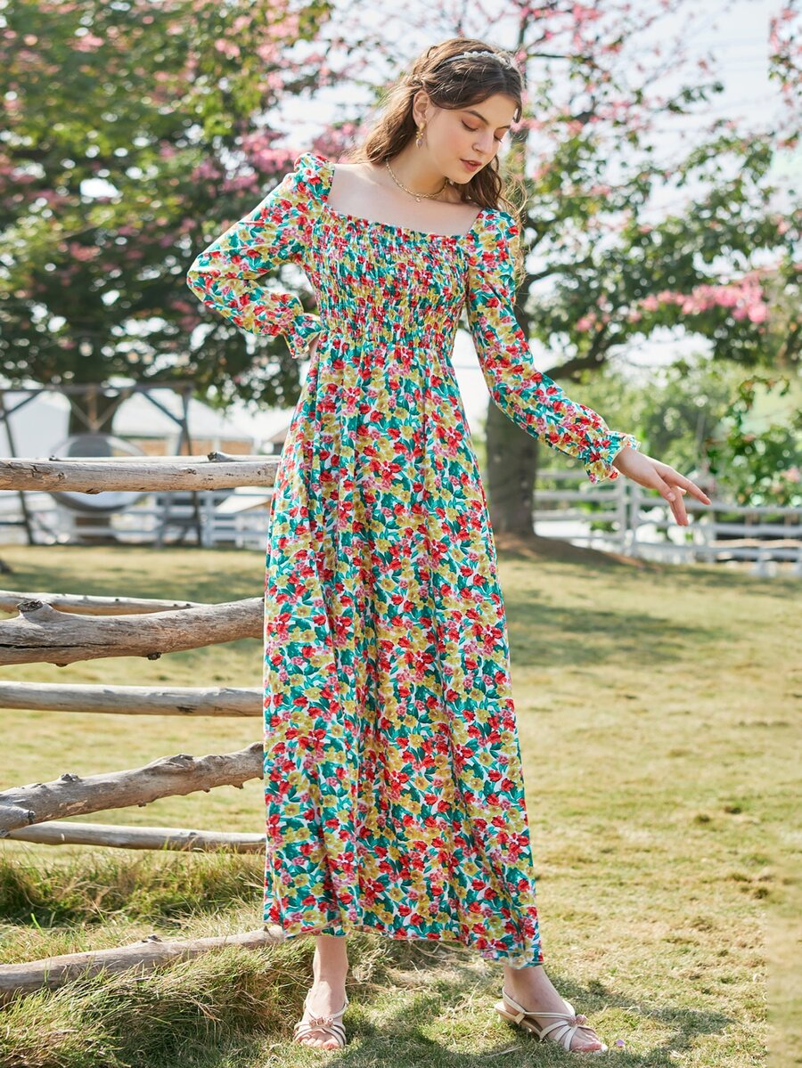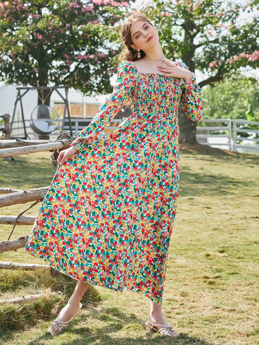 Ditsy Floral Print Square Neck Shirred Dress