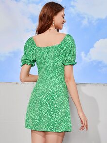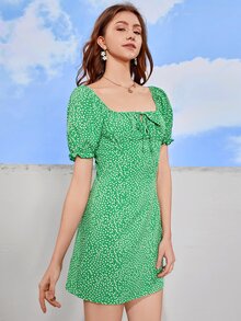 Ditsy Floral Print Tie Front Puff Sleeve Dress