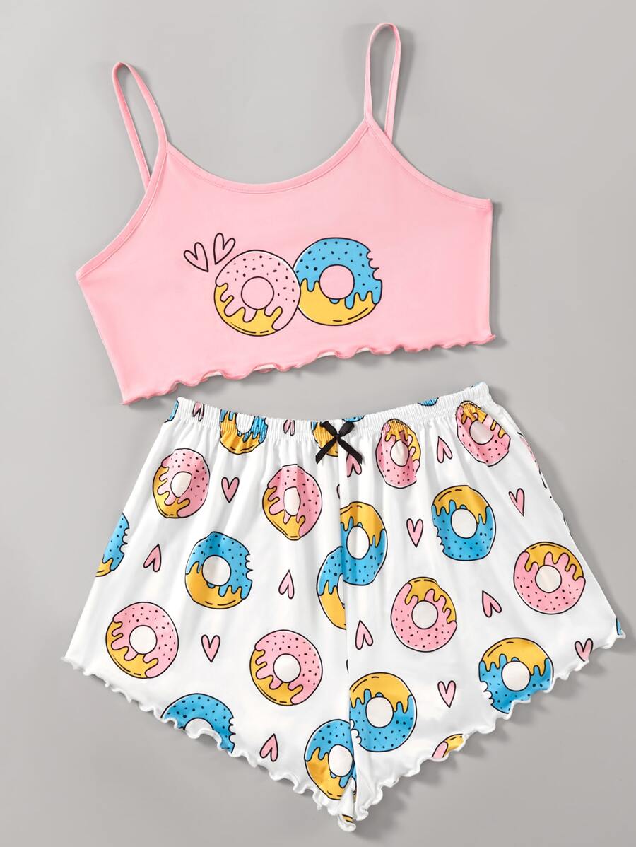 Donuts Print Lettuce Trim Cami PJ Set / Pajama Set