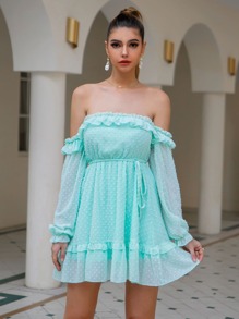Double Crazy Off Shoulder Frill Trim Swiss Dot Chiffon Dress