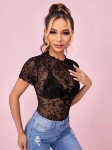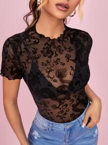 Dragon Print Lettuce Trim Sheer Mesh Top