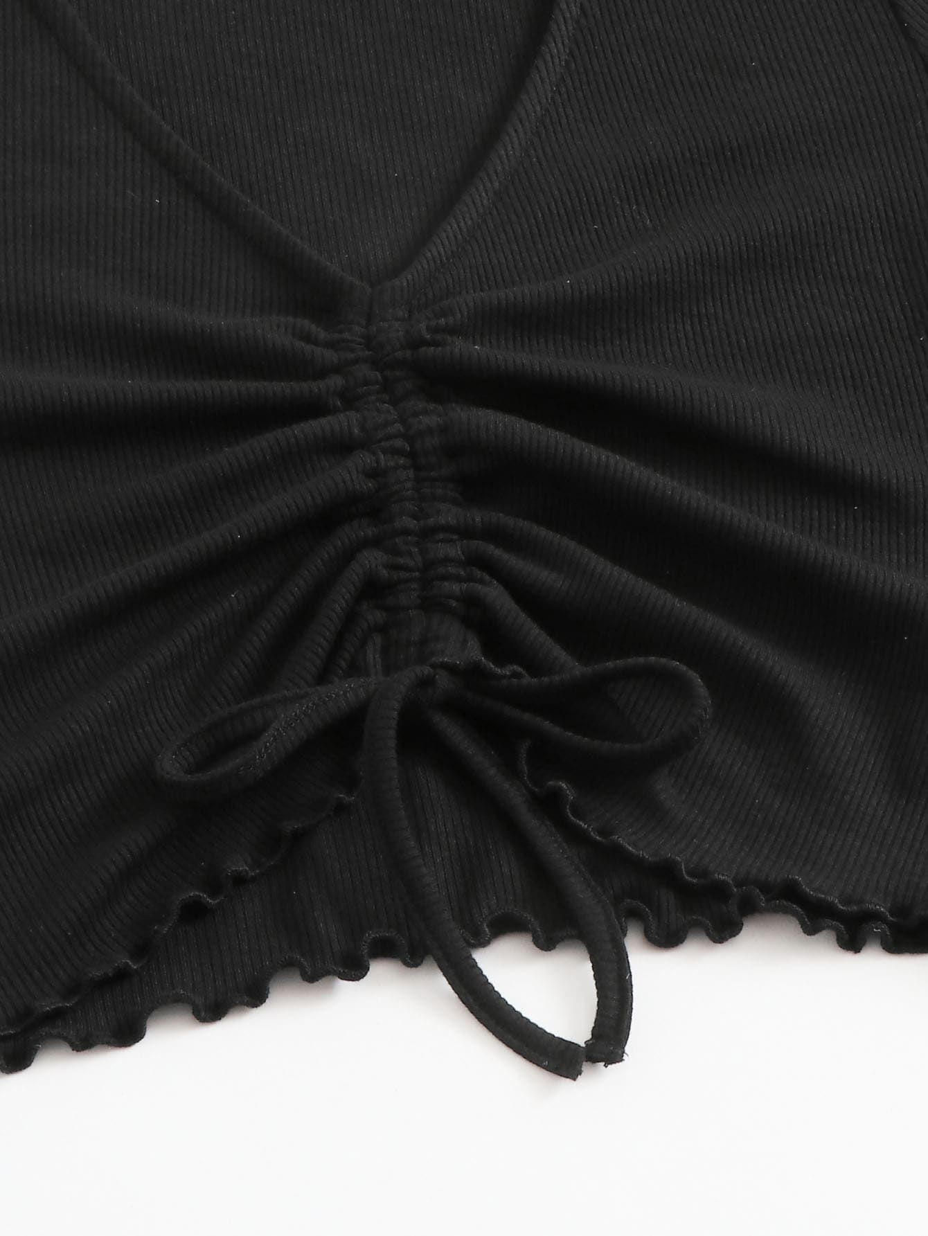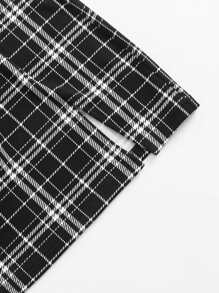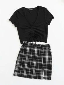 Drawstring Front Lettuce Trim Solid Top & Split Hem Plaid Skirt Set