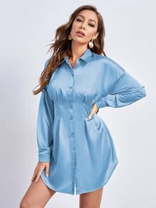 Drop Shoulder Fold Pleated Waist Satin Shirt Dress